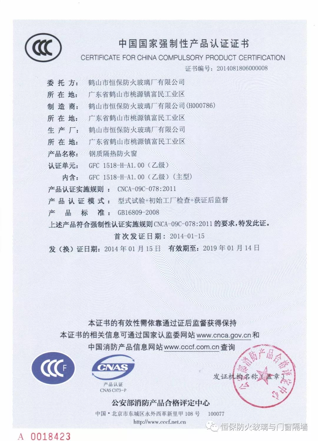 4.恒保公司一共12個產(chǎn)品獲得國家3C認(rèn)證證書,2小時和3小時鋼質(zhì)隔熱防火窗更是國家首個通過國家認(rèn)證的產(chǎn)品;
