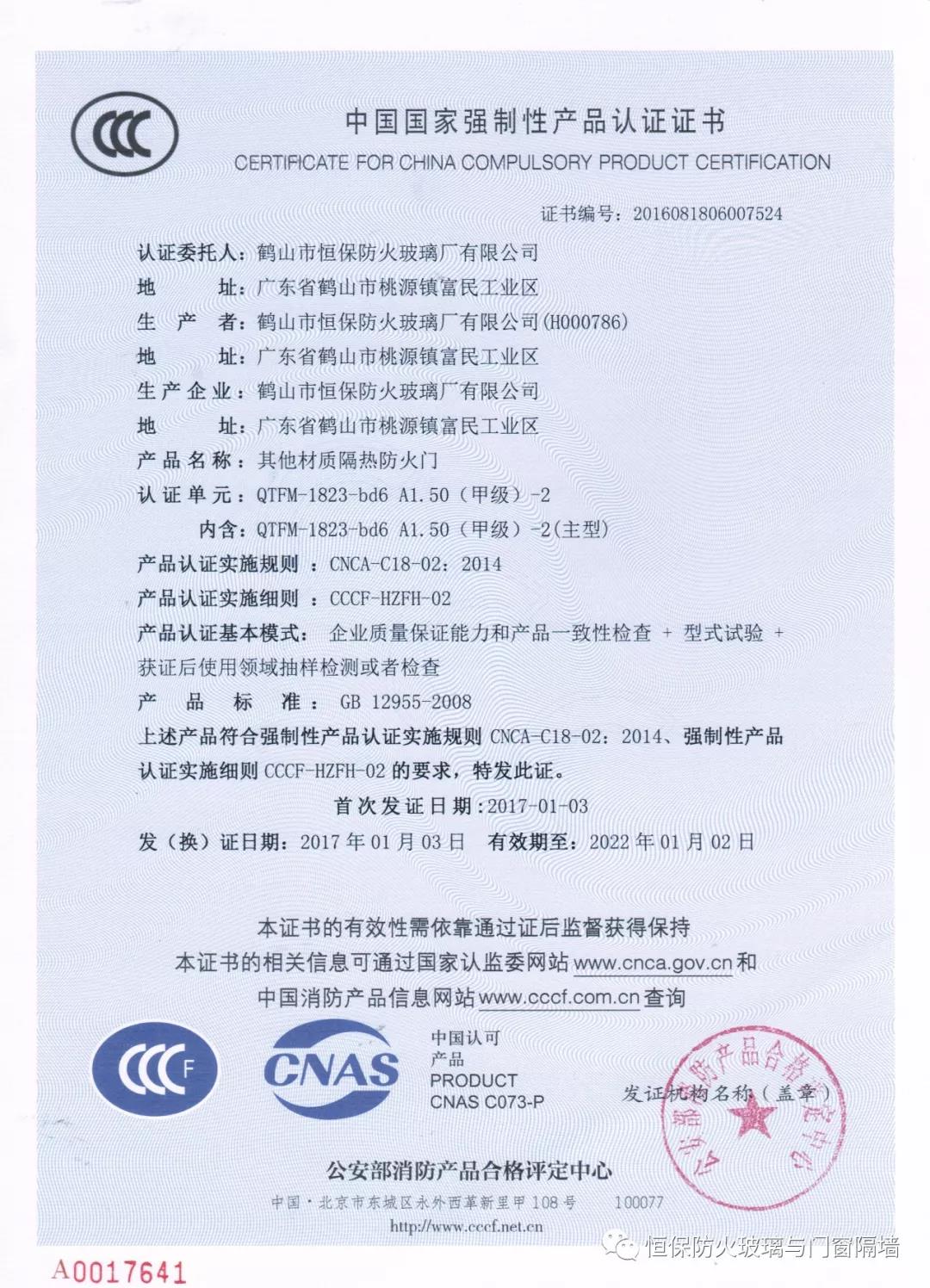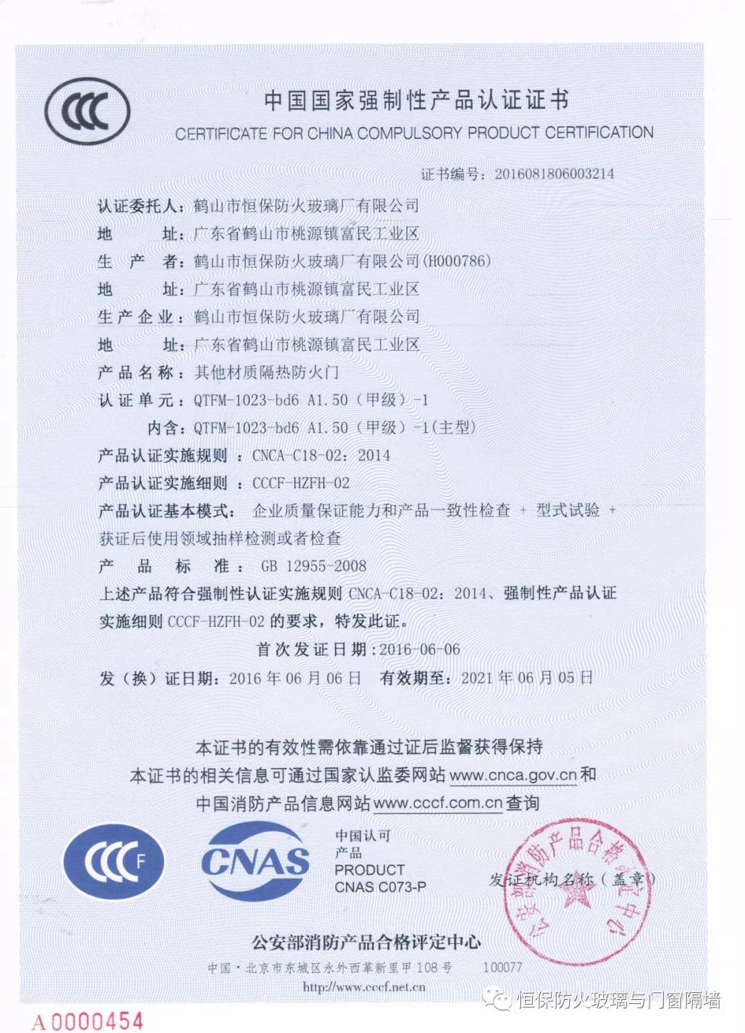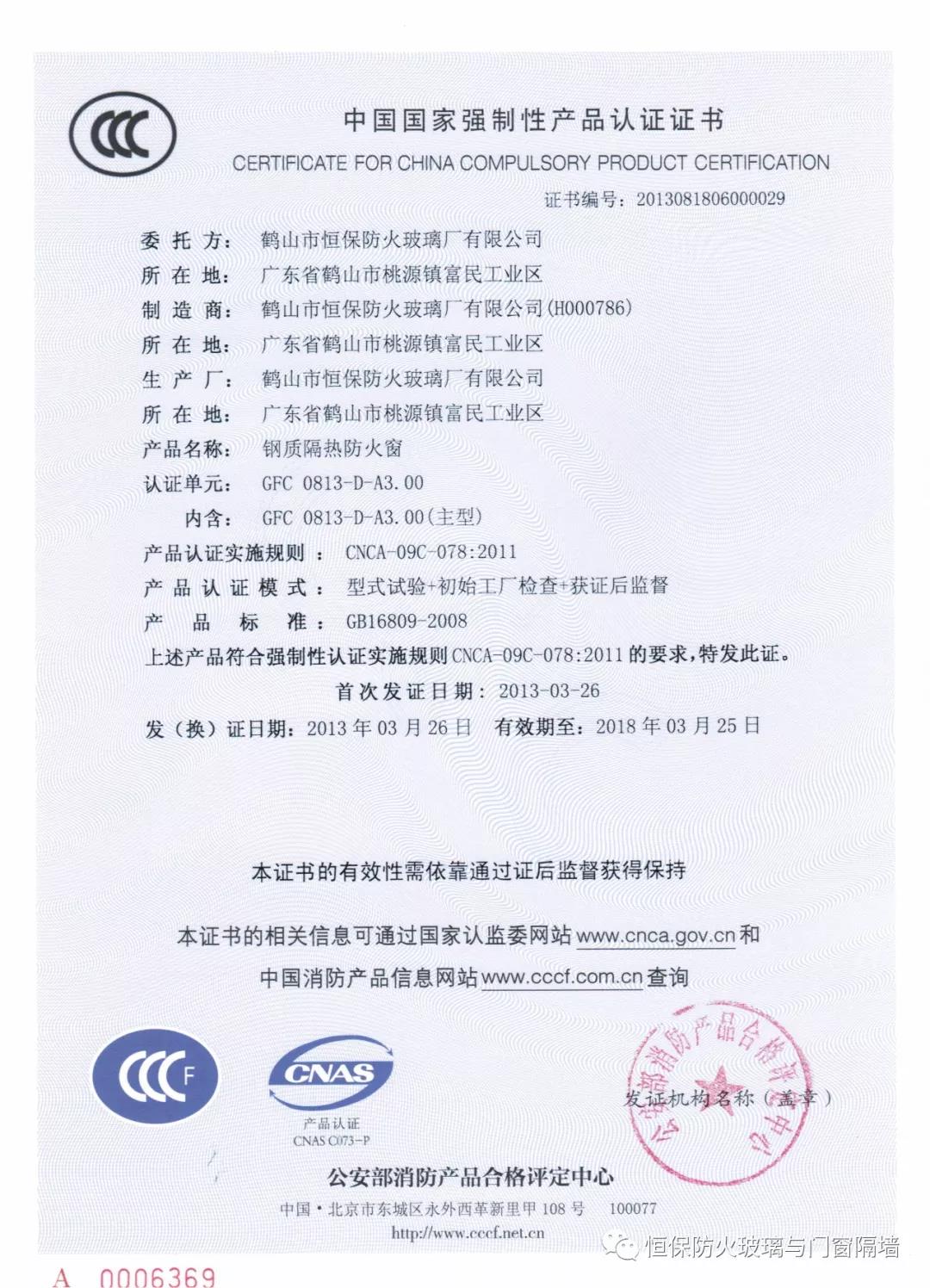 2)防火窗、防火門、防火玻璃非承重隔墻、擋煙垂壁等列入國家強(qiáng)制性認(rèn)證產(chǎn)品名錄的:需有CCC認(rèn)證證書和型式試驗報告;