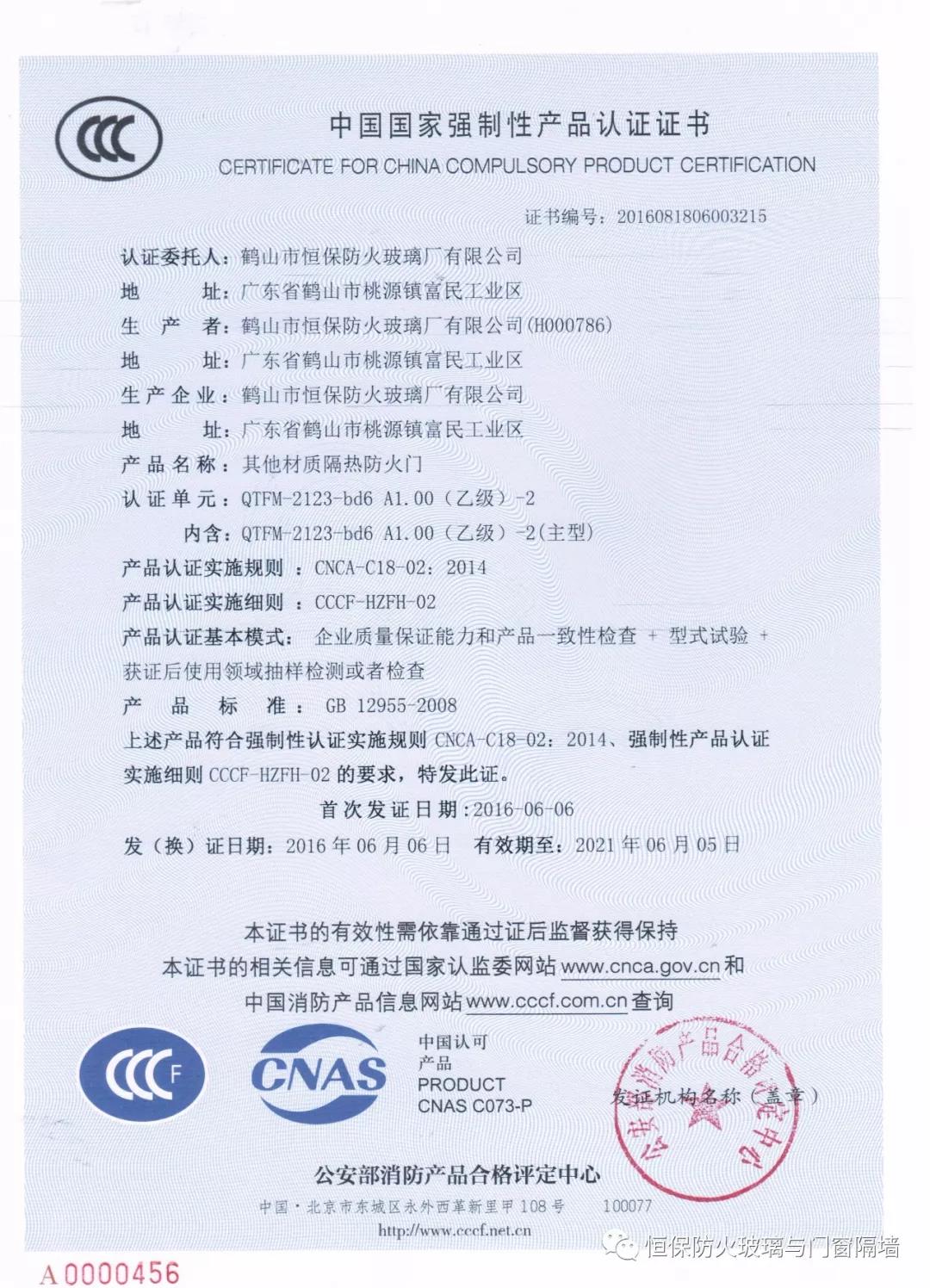 5、恒保公司一共6個產(chǎn)品獲得國家3C認(rèn)證證書,其中大版面玻璃防火門2100mmX3000mm;