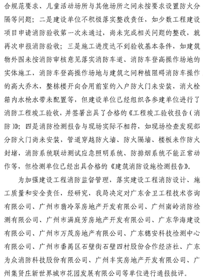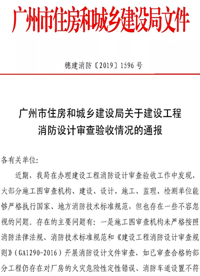 近期,廣州市住房和城鄉建設局在辦理建設工程消防設計審查驗收工作中發現,大部分施工圖審查機構、建設、設計、施工、監理、檢測單位能夠嚴格執行國家、地方消防技術標準規范,但也存在一些不容忽視的問題。存在的主要問題有: - 一是施工圖審查機構未嚴格按照消防法律法規、消防技術標準規范和《建設工程消防設計審查規則》(GA1290-2016)開展消防設計文件審查,如已審查合格的部分工程仍存在對廠房的火災危險性定性錯誤、消防車道設置不符合規范要求、兒童活動場所與其他場所之間未按要求設置防火分隔等問題。