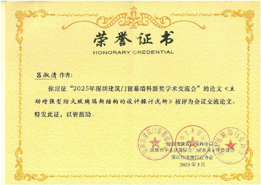 在2025科源獎(jiǎng)獲獎(jiǎng)學(xué)術(shù)論文及學(xué)術(shù)交流先進(jìn)單位頒獎(jiǎng)儀式中,恒保公司共3篇論文榮獲學(xué)會(huì)表彰,其中工程師勞梓明撰寫的《防火玻璃門承載密封隔熱優(yōu)化的分析和應(yīng)用》被評(píng)為《現(xiàn)代建筑門窗幕墻技術(shù)與應(yīng)用——2025科源獎(jiǎng)?wù)撐募啡脒x論文!