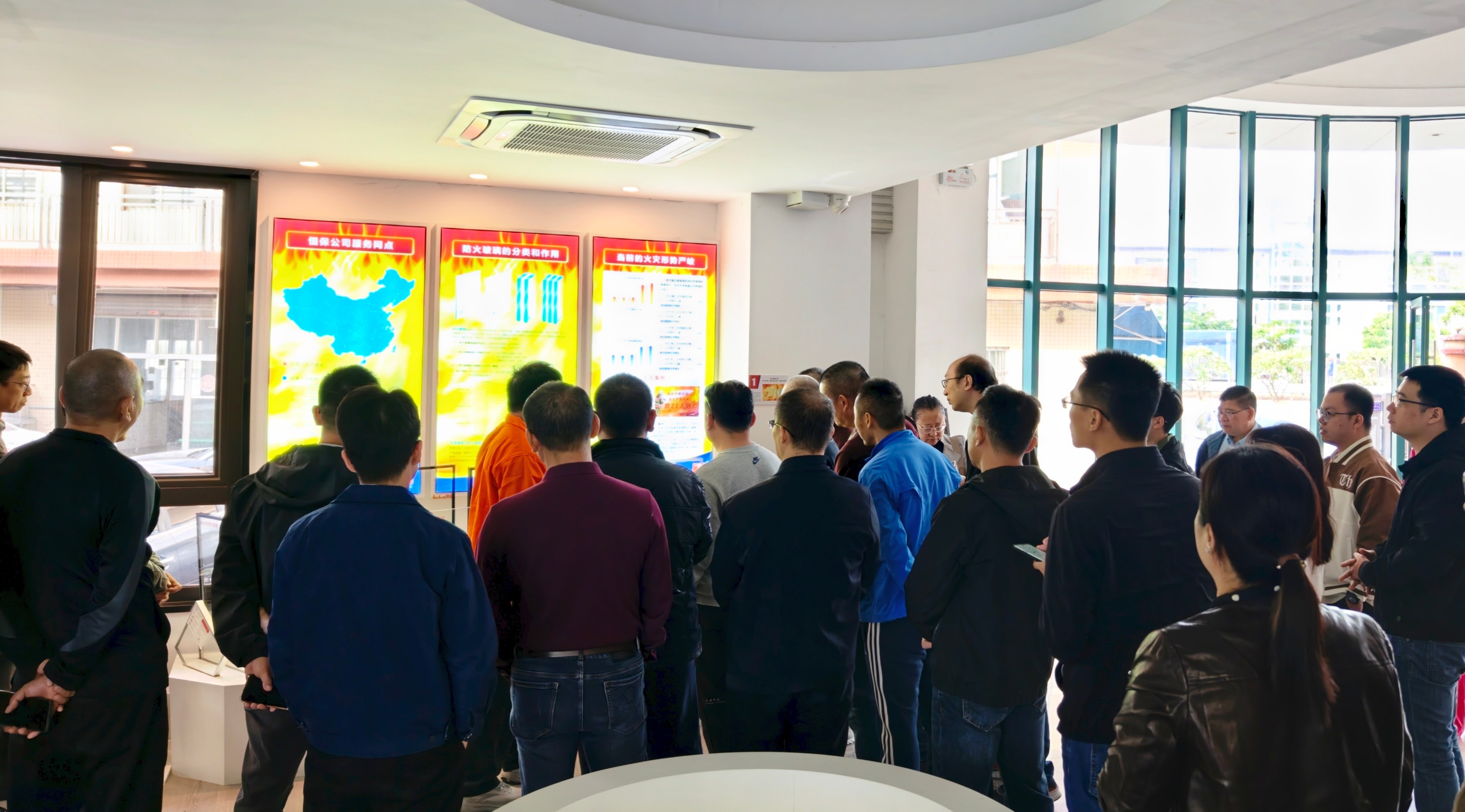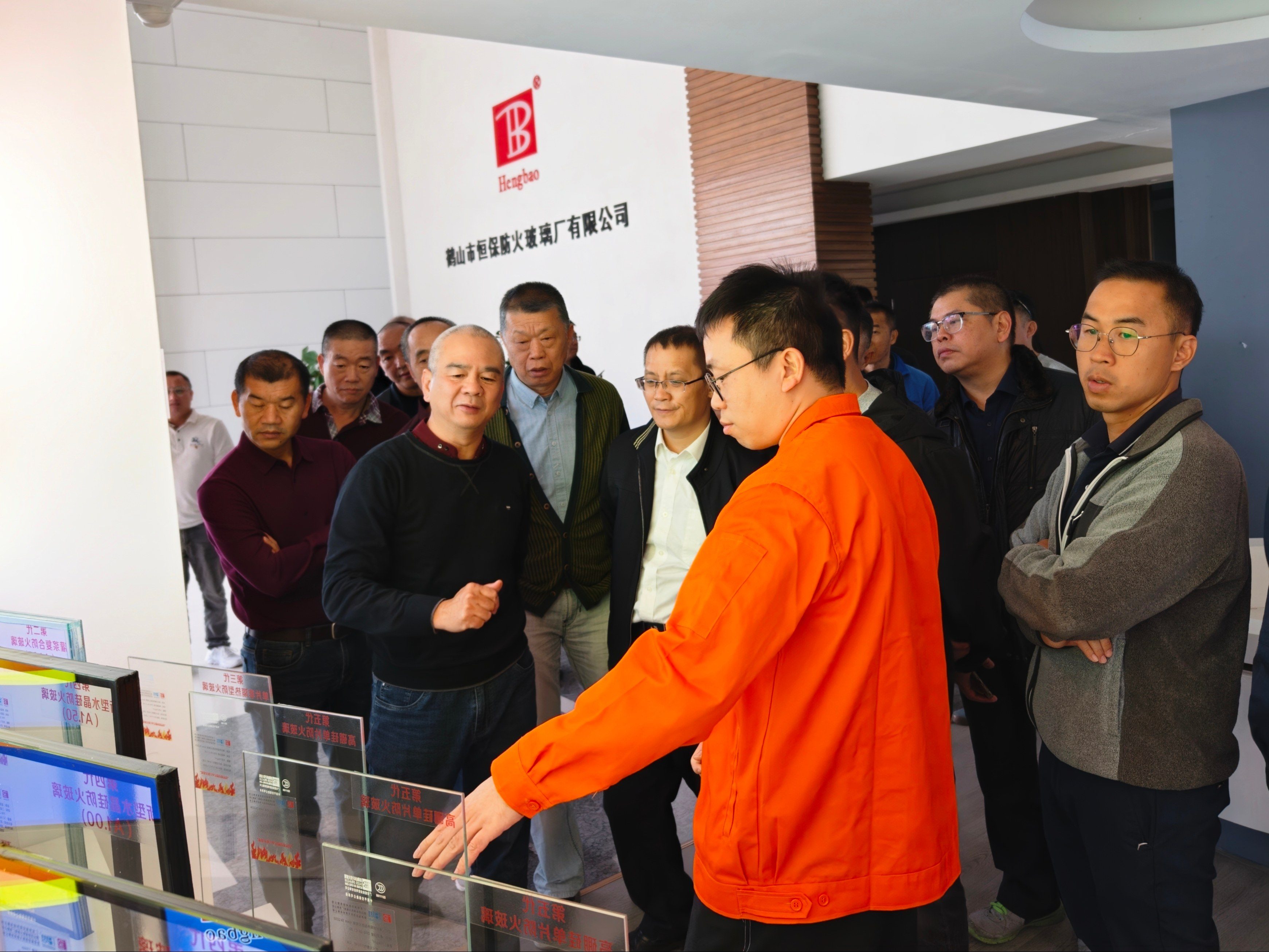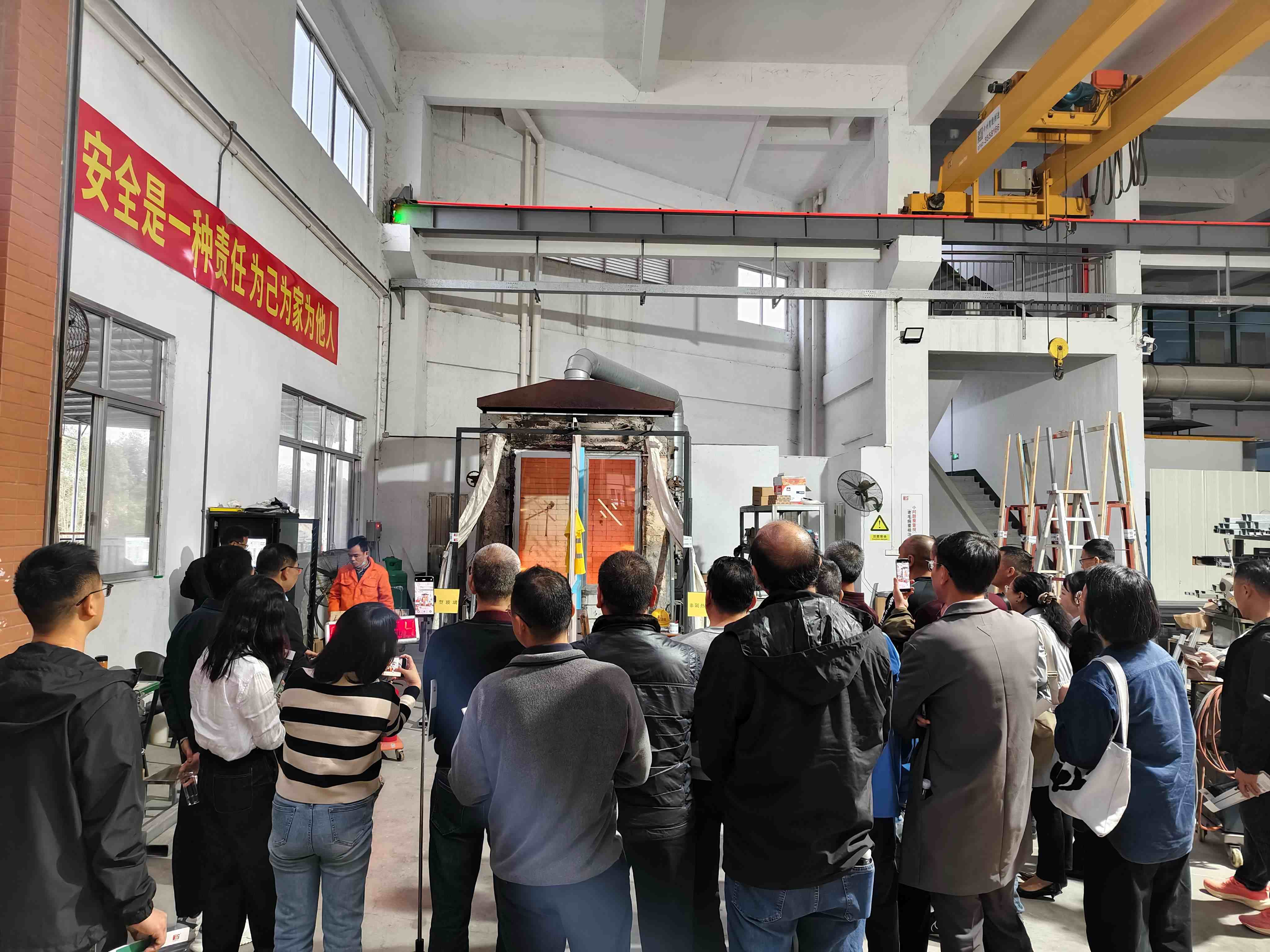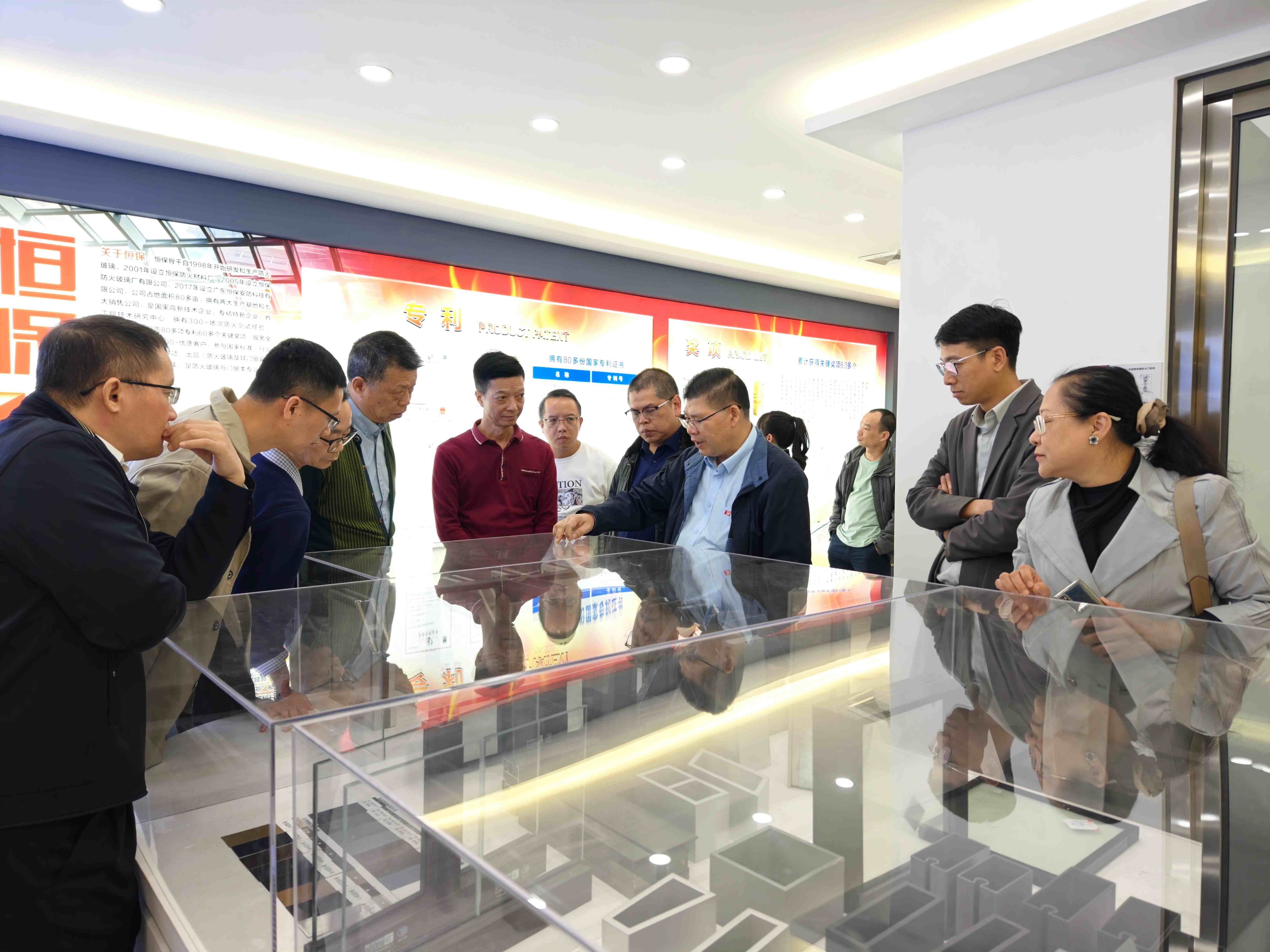 考察團前往恒保研發實驗樓觀看隔熱型防火玻璃與非隔熱型防火玻璃的對比實驗,通過直觀對比和專業講解,對不同類型的防火玻璃有了全方位認知。