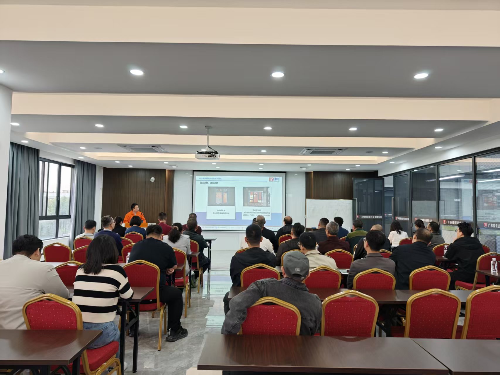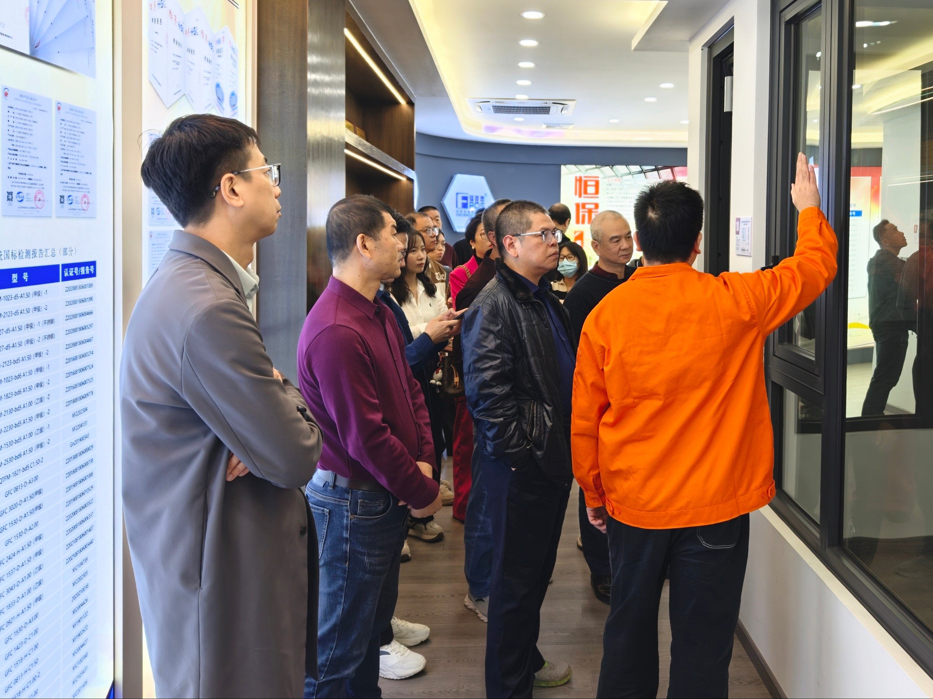 參訪團一行首先參觀恒保展廳,從企業發展歷程到各類防火核心產品,全方位展現了公司深耕行業多年的技術積淀與綜合實力。代表們駐足聆聽,就產品性能參數、實際應用場景等問題展開熱烈交流,對公司的研發實力和產品體系給予了認可。