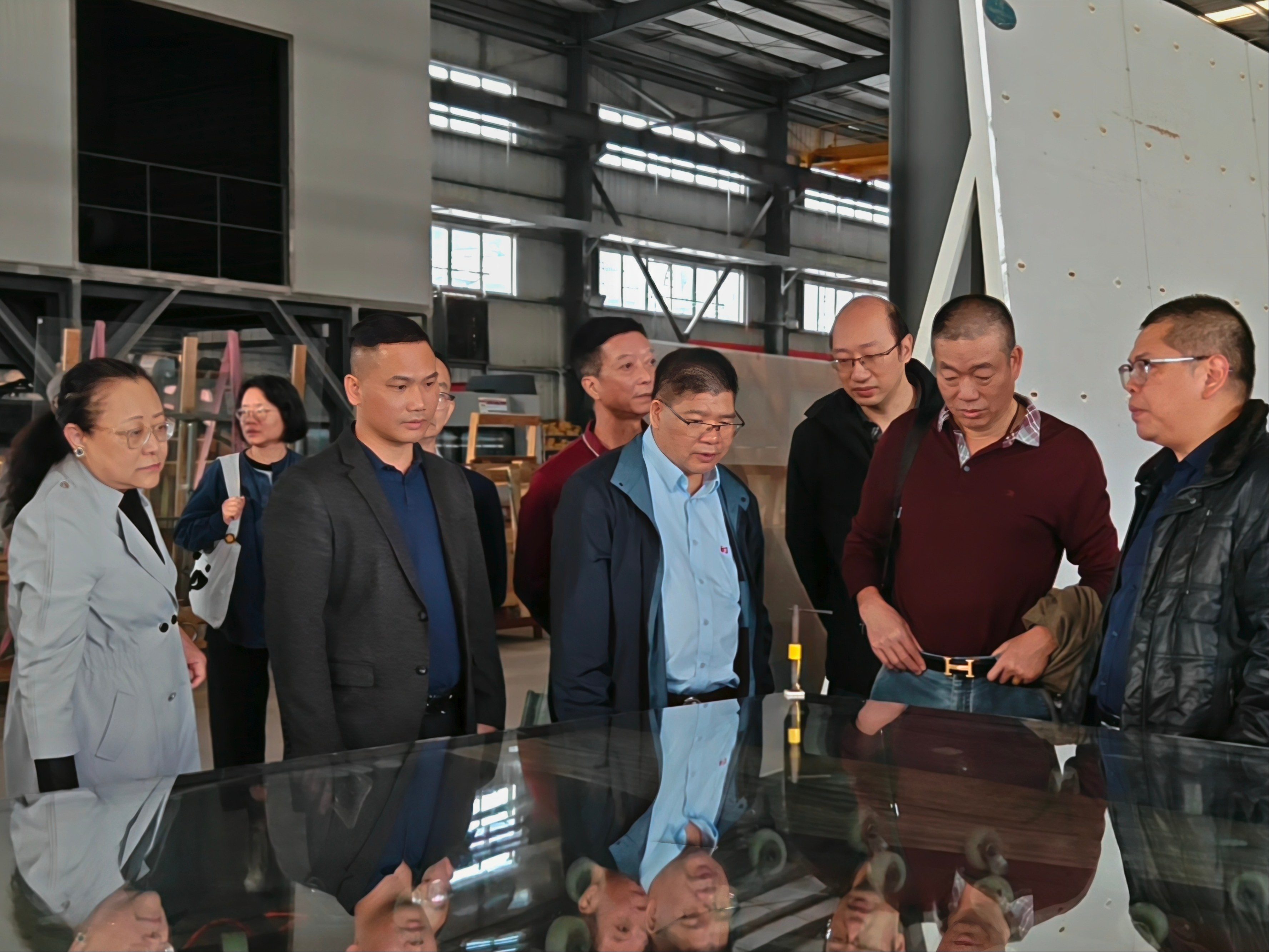 在董事長與業務經理的引導下,考察團移步至公司自動化生產車間。業務經理向代表們系統講解了防火玻璃從原片到成品的完整工藝流程,介紹了智能化生產設備在提升產品精度與穩定性方面的作用。
